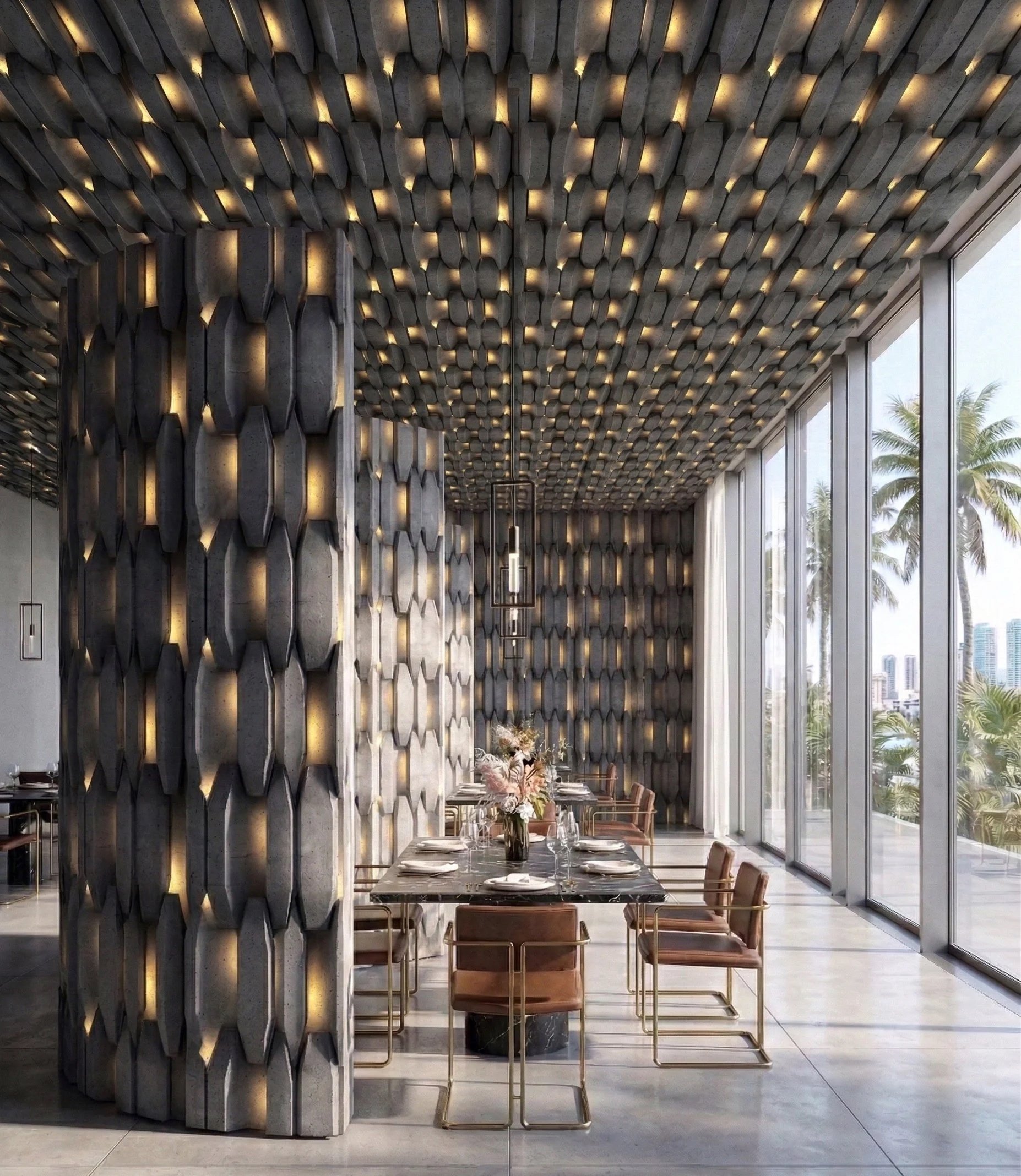 Fluted vertical forms produce a smooth cadence of light and dimension. The printed illumination adds warmth, while repeat customization allows for either dramatic scale or subtle repetition.