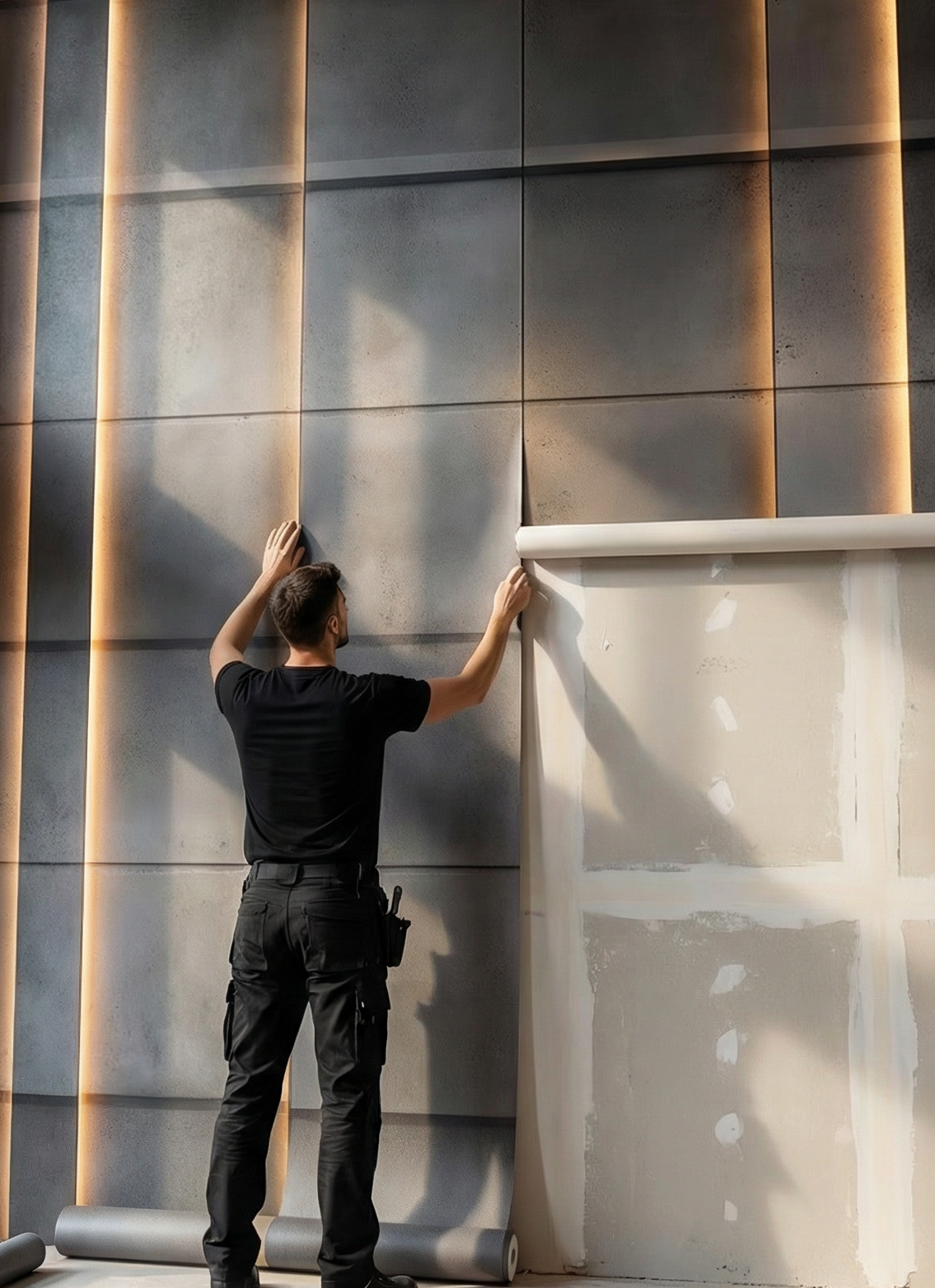 Vertical concrete-inspired wallpaper panels with integrated printed glow create a disciplined rhythm of light and shadow. Custom scale the repeat for a grand mural effect or tile it tighter for a more architectural cadence.