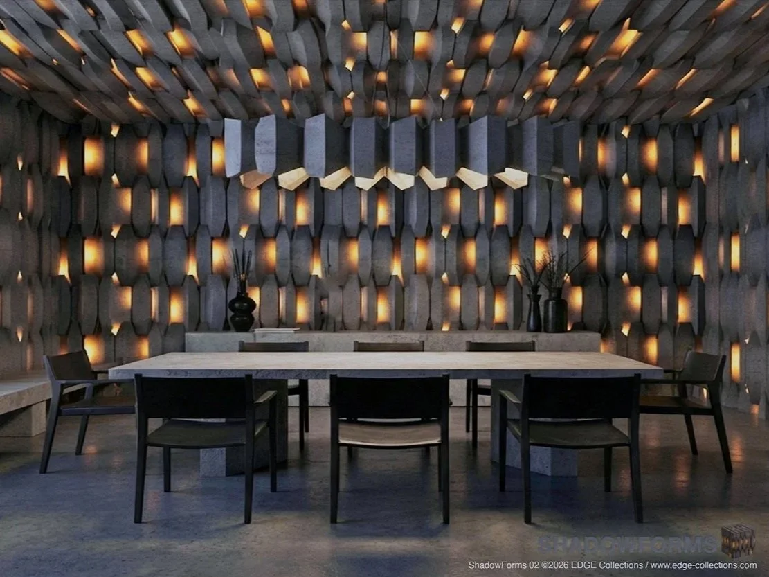 The collection marks a conceptual departure from EDGE's signature use of vibrant color and pattern, embracing restraint as a new form of expression. Yet, it remains deeply connected to the studios core principles: scale, material integrity, and craftsmanship. Each ShadowForm can be used across walls, ceilings, or full spatial enclosures, transforming interior architecture into immersive, monolithic environments that feel carved from light itself.